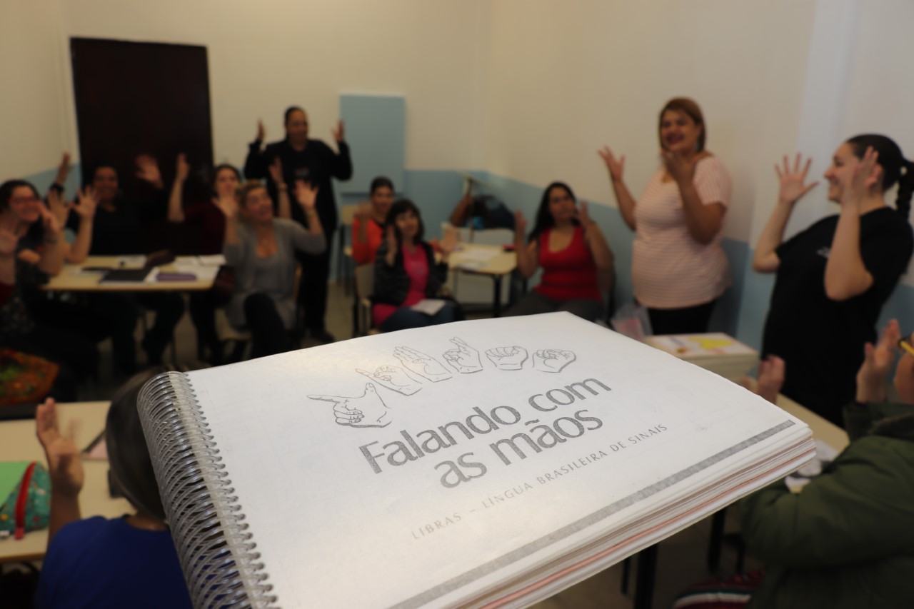A Oficina de Libras é oferecida gratuitamente aos professores da rede municipal de ensino e tem como objetivo incentivar docentes a utilizarem, no ambiente escolar ou em situações cotidianas, a Língua Brasileira de Sinais.