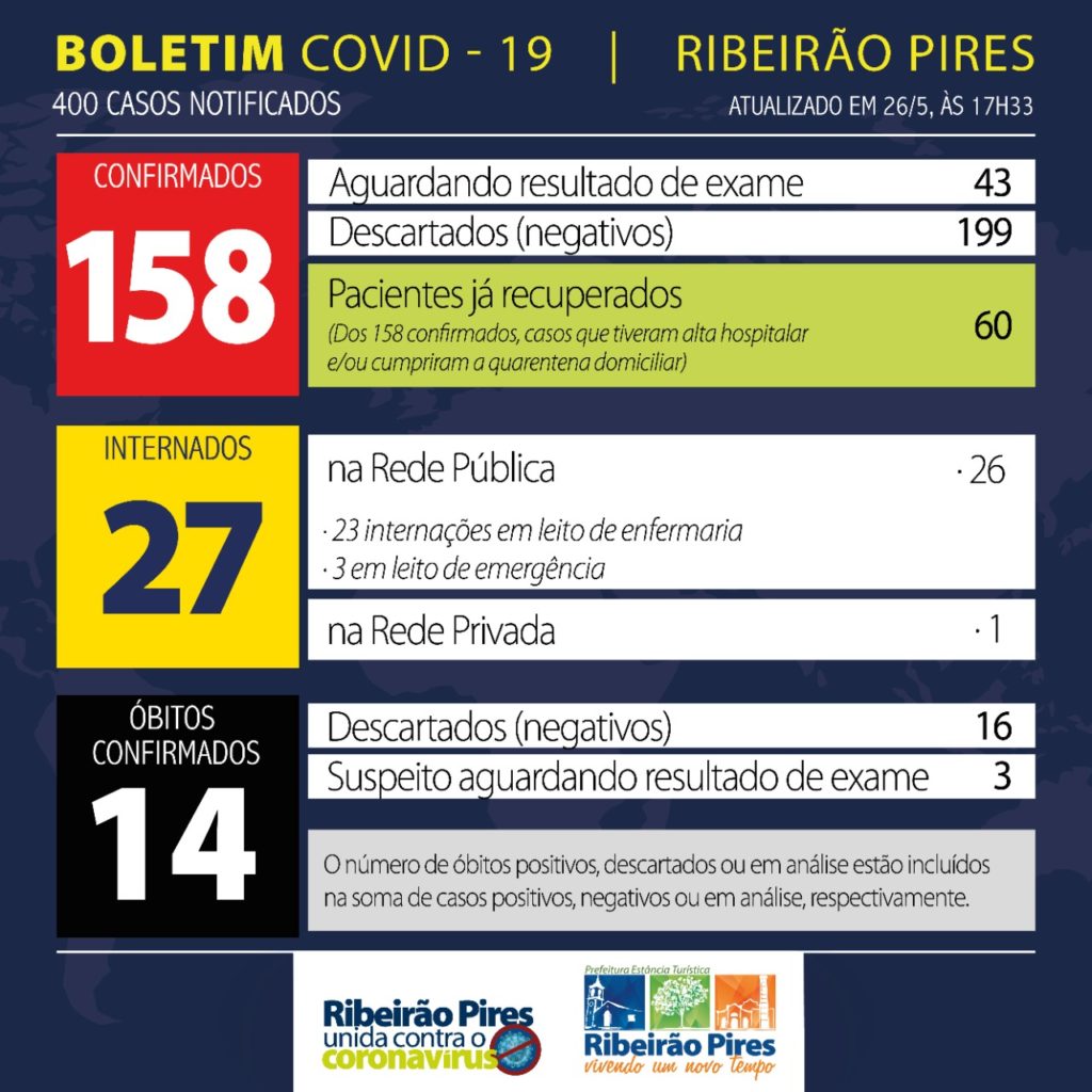 Com isso, passam para 14 os óbitos confirmados por COVID-19 em Ribeirão Pires. A cidade tem 158 casos positivos de coronavírus; 199 casos negativos da doença; e 43 suspeitas em análise laboratorial, incluindo 3 óbitos. Do total de casos suspeitos, 60 pessoas já se recuperaram – tiveram alta hospitalar e/ou cumpriram a quarentena e não apresentam mais sintomas. 16 mortes com causa suspeita foram descartadas para COVID-19.