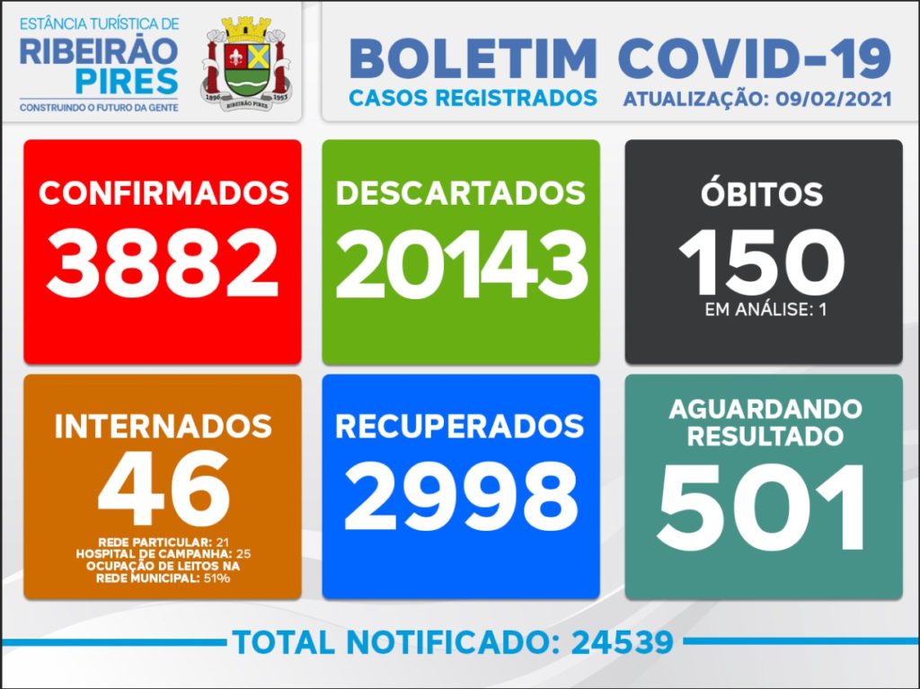 Nesta data (09/02), há 21 pacientes internados na rede municipal da cidade, no Hospital de Campanha, 4 em leitos de emergência e 17 em leitos de enfermaria. A ocupação de leitos exclusivos para casos COVID-19 na rede municipal (Hospital de Campanha) é de 51%.