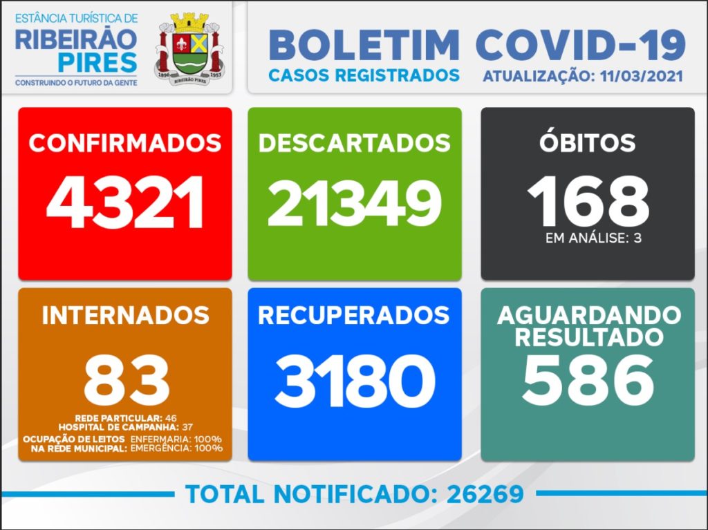 Ribeirão Pires recebeu hoje, dia 11, a confirmação de 4 mortes por coronavírus entre moradores do município, totalizando 168 óbitos pela doença. Trata-se de uma senhora de 58 anos que estava internada no Hospital de Campanha e faleceu no dia 9/03; um homem de 41 anos que estava internado no Hospital de Campanha e faleceu no dia 27/02; um senhor de 69 anos que estava internado no Hospital Nardini e faleceu no dia 7/03; e uma senhora de 90 anos que estava internada no Hospital de Campanha e faleceu no dia 6/03.